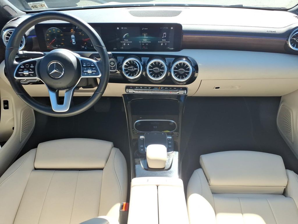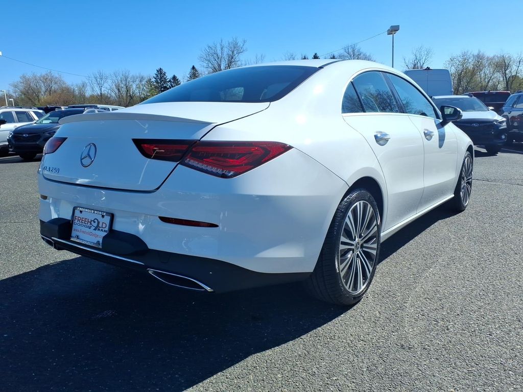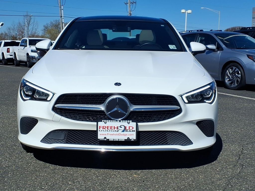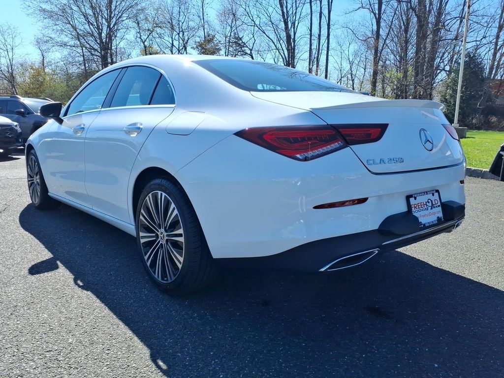 2022 Mercedes-Benz CLA 250 Coupe in Polar White with Macchiato Beige interior. Spec sheet lists a 2.0L I-4 turbo engine with front-wheel drive and a 7-speed dual clutch transmission. EPA-estimated 25 city / 36 highway MPG.